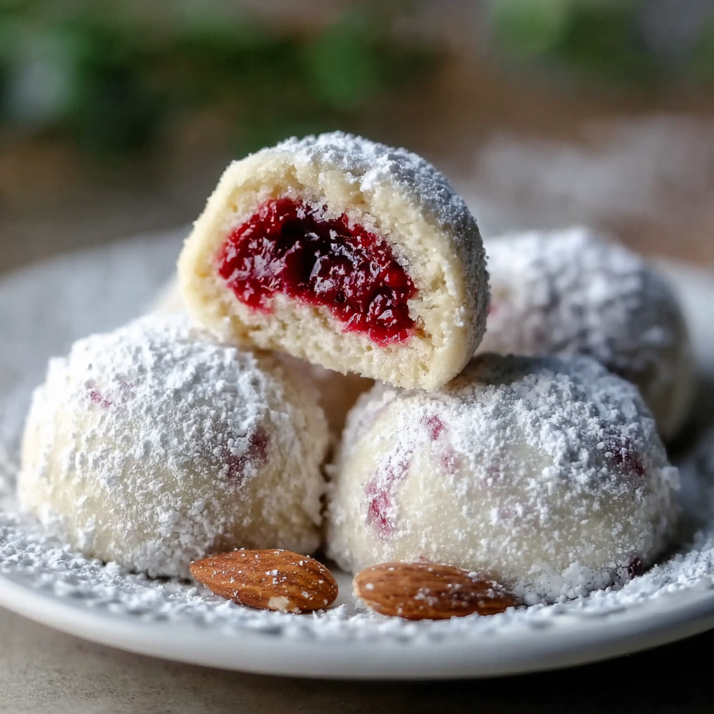 Raspberry Filled Almond Snowball Cookies
